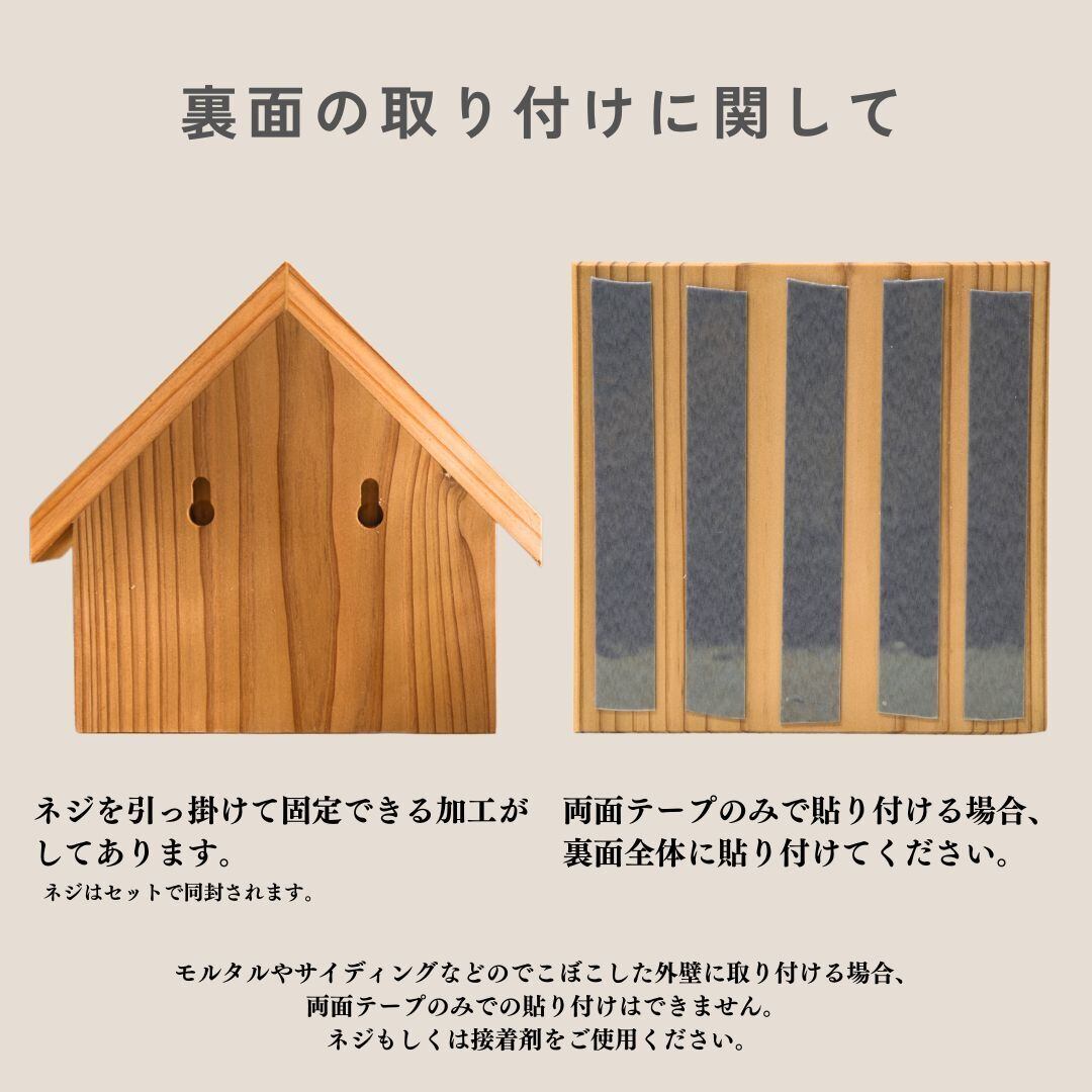 日本の森林で育った国産の木材です。天然素材のため、1つ1つの見た目が違いそれぞれの個性を楽しむことができます。杉材は軽い割に強度があるので、木製表札の中でも軽量な表札となっています。また、玄関先に設置しても、風雨に負けず長持ちします。室内に設置すれば、湿気を吸ったり放出したりするので、玄関周りの湿度を自然に調整してくれて、いつも快適な空間を保ってくれます。